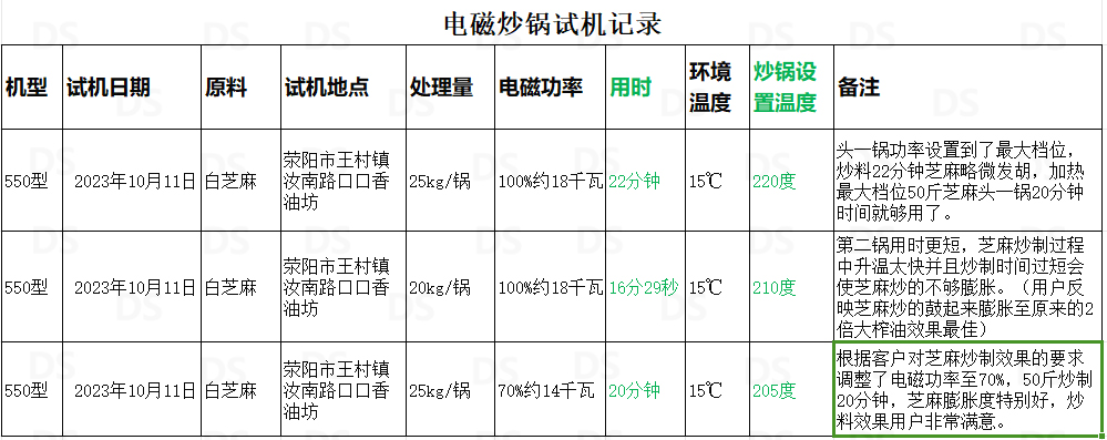 今天是2023年10月11日,今天早上我們的新型550電磁炒貨機在滎陽市王村鎮(zhèn)汝南路口口香油坊進行了測試試用,測試物料為白芝麻,用戶壓榨香油用。用戶油坊內(nèi)現(xiàn)有的電磁炒貨機每鍋可裝芝麻160斤,電磁功率跟我們相同為20千瓦,炒50斤芝麻冷鍋情況下需要32分鐘左右。我們的炒貨機冷鍋情況下50斤芝麻用時22分鐘(根據(jù)實際情況20分鐘即可炒好),今天測試了三鍋,平均每鍋用時20分鐘左右,用戶對我們的炒料效果和效率非常滿意。詳細測試數(shù)據(jù)我列了個表,大家可以看下。