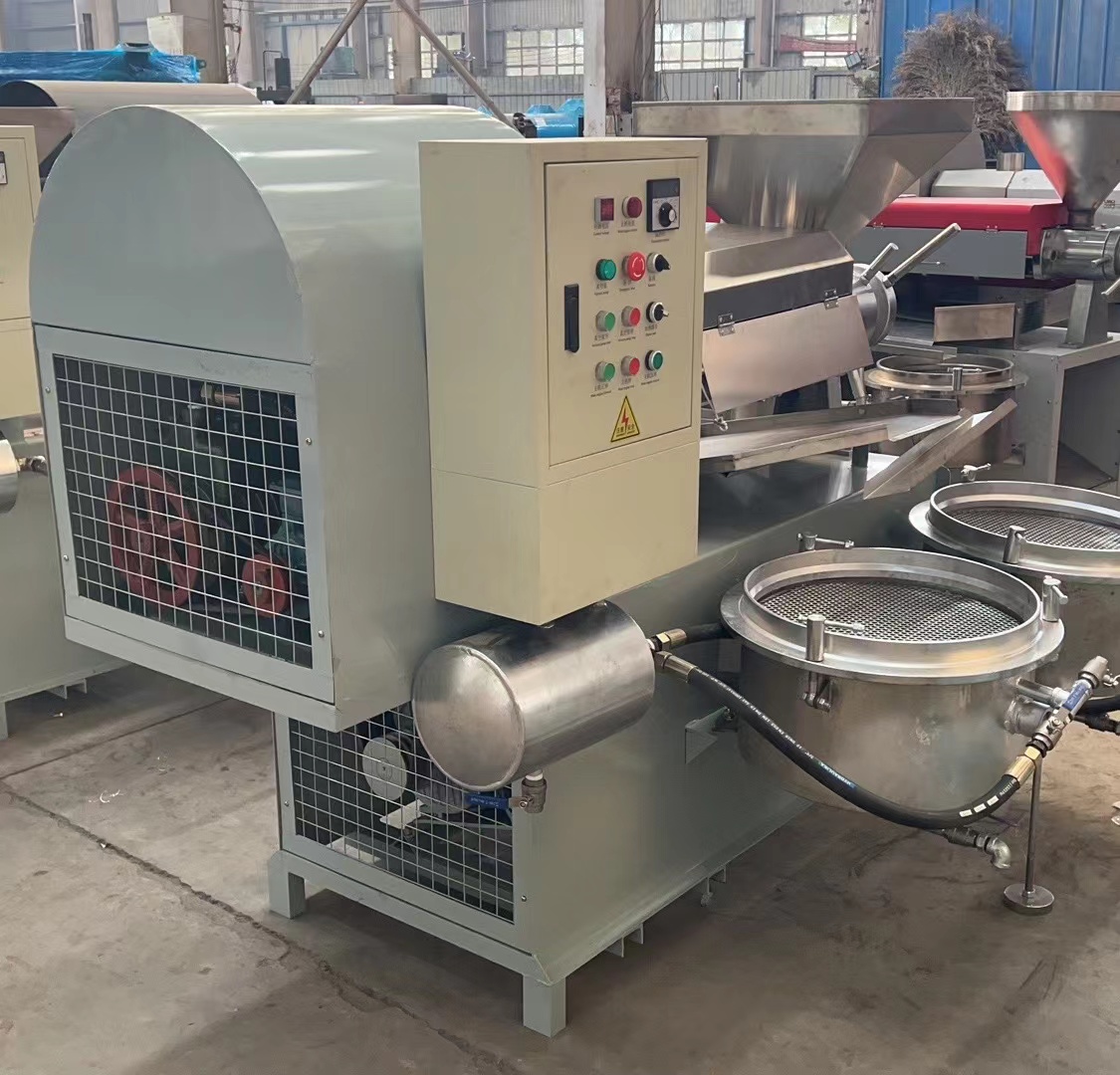 7.新榨油機(jī)安裝后進(jìn)行4—8小時(shí)磨榨,方法是用已榨干油的餅料從料斗中緩緩喂入,反復(fù)回榨,使榨膛磨光,切記開(kāi)始磨榨不要將料直接倒入料斗內(nèi),而以手抓喂入為宜,以防榨螺軸卡死。如喂料過(guò)猛,榨膛內(nèi)出現(xiàn)異常響聲或榨螺軸卡死,應(yīng)立即停車(chē),消除梗阻,或重新裝配好后再啟動(dòng)磨榨,嚴(yán)禁強(qiáng)行拖車(chē)。8.正常榨油時(shí),必須保持進(jìn)料均勻,切勿過(guò)多過(guò)少或斷料空轉(zhuǎn)。此時(shí)機(jī)器負(fù)荷正常,運(yùn)轉(zhuǎn)平穩(wěn),響聲有節(jié)奏。出餅順暢,低壓段基本無(wú)渣,高壓段有少量油渣,但渣在油中的比例不大于10%,榨膛內(nèi)溫度可達(dá)150—200℃,出餅口出冒出青煙應(yīng)通過(guò)護(hù)罩由抽煙管排出。榨出熱餅要及時(shí)攤開(kāi),不要急于打堆或裝運(yùn),否則會(huì)產(chǎn)生自然現(xiàn)象。當(dāng)連續(xù)工作時(shí)間較長(zhǎng),機(jī)溫過(guò)高時(shí),應(yīng)采取電扇吹風(fēng)等降溫措施。